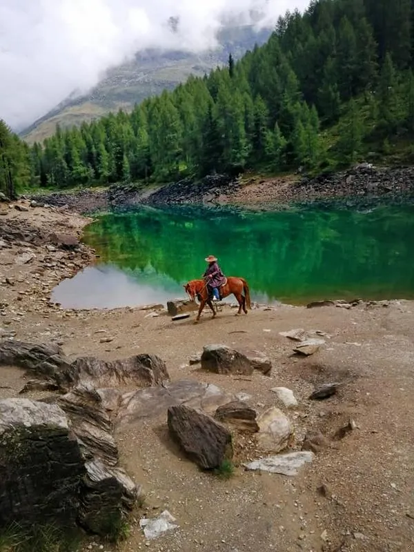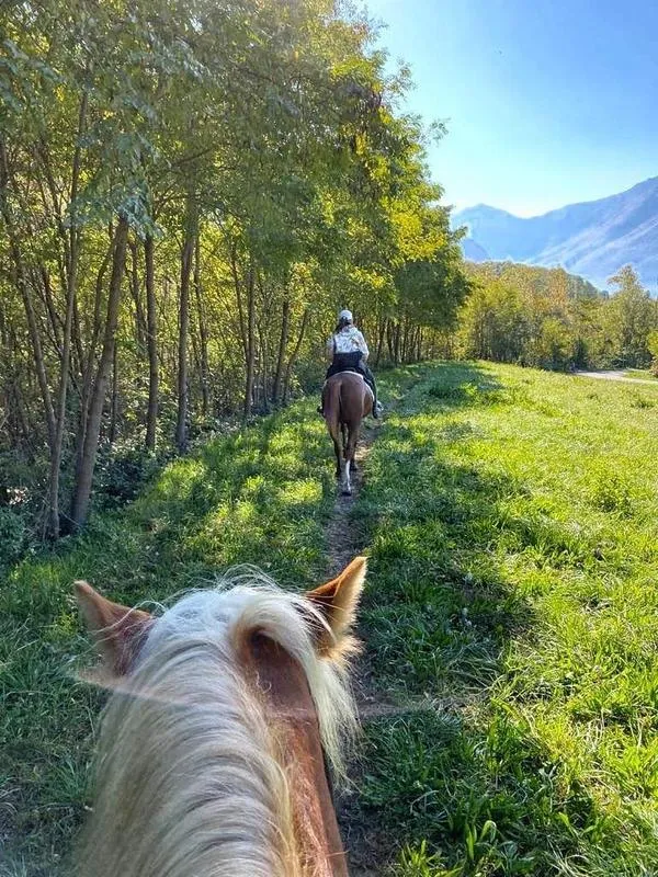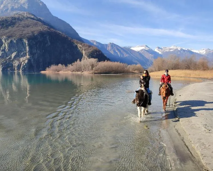 Si parte dal maneggio, si va verso il lago, si va in spiaggia (a meno che non sia inagibile), si passa dai campi e si rientra al ranch. Si possono fare anche di 2 ore: si scende al lago e si va su verso la Valtellina facendo un po' di bosco.